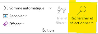 - Utiliser l’outil de recherche avec Ctrl + F ou (dans Excel) en cliquant sur « Rechercher et sélectionner » puis « Rechercher »